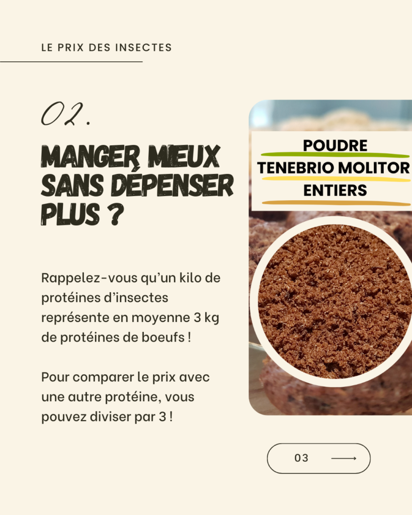 Le prix des insectes peut parfois sembler élevé, mais il est important de prendre en compte leur valeur nutritionnelle. Un kilo de protéines d’insectes équivaut en moyenne à 3 kg de protéines de boeuf. En comparant le prix au prorata de la quantité de protéines, on se rend compte que les insectes sont une option économique intéressante.