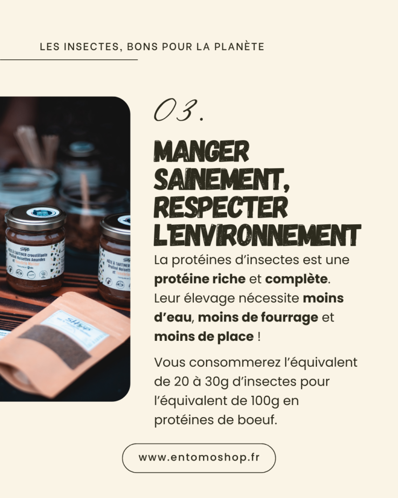 En plus de leurs qualités nutritionnelles, les insectes sont une solution durable pour notre planète. Leur élevage génère moins de gaz à effet de serre et consomme moins de ressources naturelles que l’élevage traditionnel. En choisissant de consommer des insectes, vous faites un geste pour l’environnement.