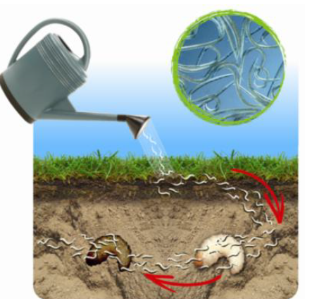Les nématodes Heterorhabditis bacteriophora, efficaces en lutte biologique, recherchent et parasitent activement les larves des ravageurs dans le sol. Dès qu’ils les trouvent, ils pénètrent le corps de la victime par les voies naturelles et s’y multiplient. Ce processus entraîne la mort des larves en seulement quelques jours (elles prennent alors une couleur brun rougeâtre). Ensuite, après 2 à 3 semaines, les nouveaux nématodes (jusqu’à 1000 par ver blanc) quittent leur victime pour attaquer d’autres larves, prolongeant ainsi l’efficacité du traitement.