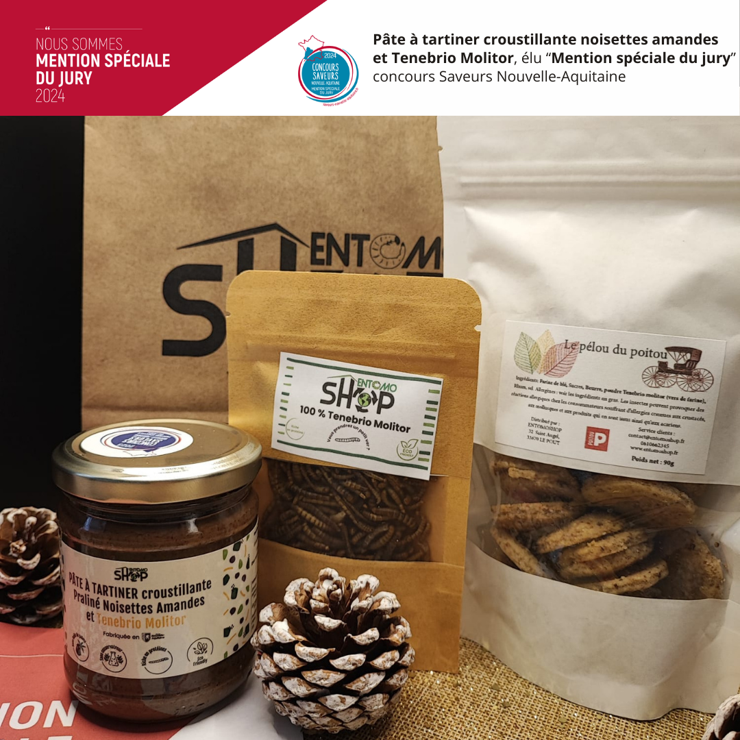 Plongez dans une expérience gustative d’exception avec notre pâte à tartiner au praliné et Tenebrio Molitor, lauréat de la Mention Spéciale du Jury 2023 et 2024 au concours saveurs de la Nouvelle-Aquitaine organisé par l’Aana. Cette création audacieuse associe la douceur onctueuse du praliné aux noisettes du Lot et Garonne et aux amandes avec à l’originalité de la texture des ténébrions meuniers ! Ainsi, nous obtenons une symphonie harmonieuse de textures et d’arômes ! Offrez vous l’excellence et découvrez le goût bluffant de notre pâte à tartiner ! Un régal à tomber parterre !
