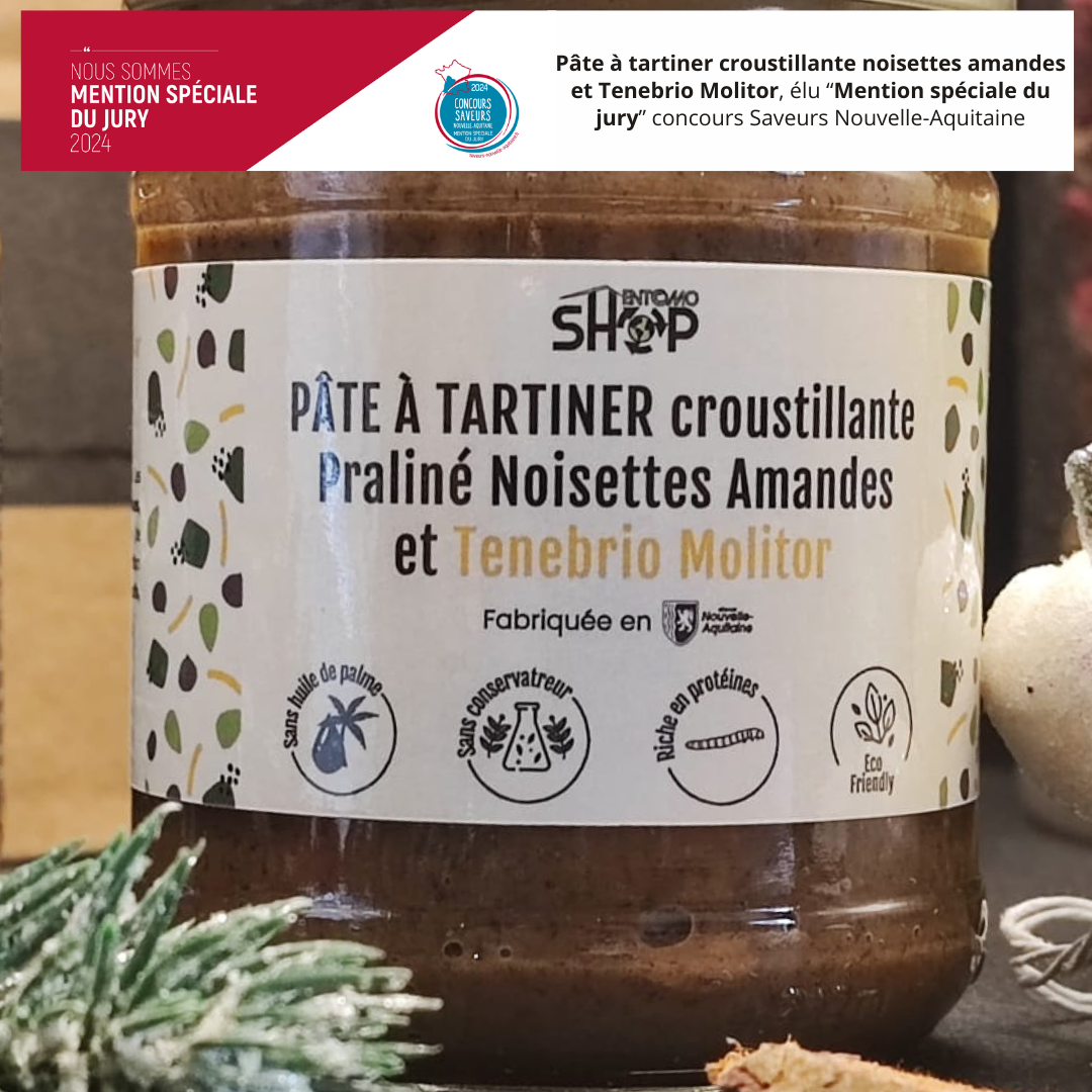 1 pot de pâte à tartiner croustillante au praliné et Tenebrio Molitor – 200g médaillé « Mention spéciale du Jury » 2023 et 2024 au concours Saveurs Nouvelle-Aquitaine