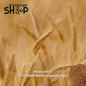 Semoule de blé dur (90 %), poudre de Tenebrio molitor déshydratée (10 %, larves de ver de farine déshydratées en poudre).